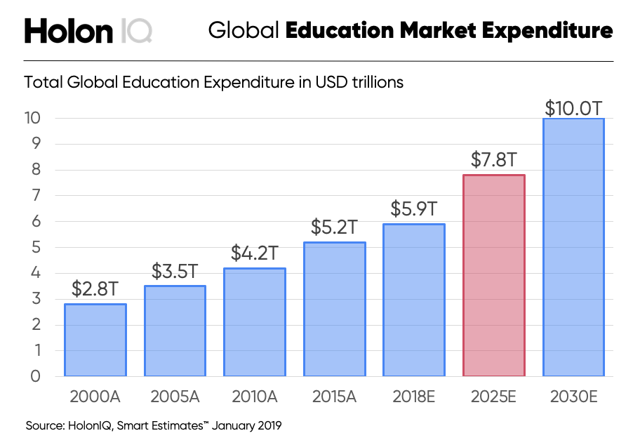 Education, a $6 trillion industry that’ll grow to nearly $8 trillion by 2025. An industry where even within these vast numbers less than 3% of expenditure is allocated to technology and digitization (Source: Holon IQ).